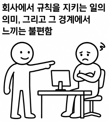 직장 생활에서 규칙을 지킨다는 것은, 어쩌면 나와 동료를 동시에 지켜내는 일인지도 모르겠습니다. 보이지 않게 조직을 안정시키고, 모두를 공평하게 만들고, 함께 일하기 좋은 환경을 만들기 위한 최소한의 배려 말입니다. 그 단단한 마음을 잃지 않기를, 그리고 그 마음이 언젠가는 더 큰 신뢰로 돌아오기를 조용히 기대해 봅니다.